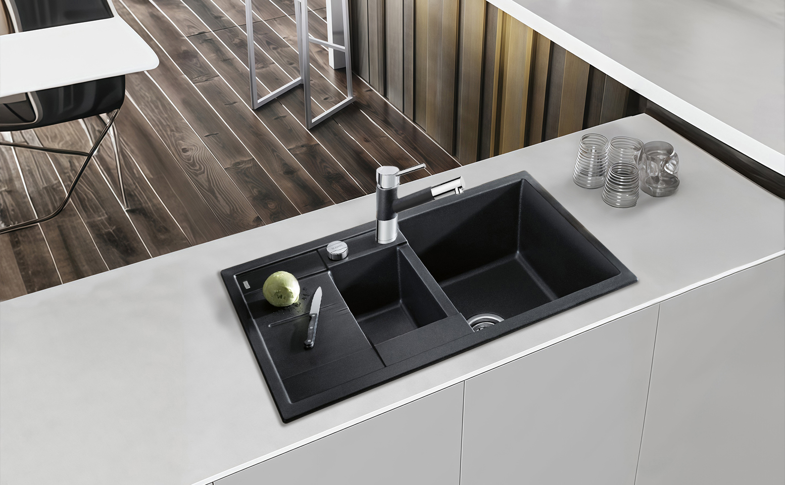 Под столешницу монтируется скрытно, что позволяет добиться ровной линии поверхности и минимизировать щели, сохраняя целостность покрытия. Вырез 400×800 мм предопределяет точную подгонку при установке, экономя время мастера и исключая необходимость корректировок. В комплект включена отводная арматура с клапаном‑автоматом InFino, обеспечивающая удобство слива и надёжную герметизацию без визуального доминирования над рабочей зоной. Такая система упрощает уход и ускоряет процедуру опорожнения, сочетая практичность с продуманной механикой.