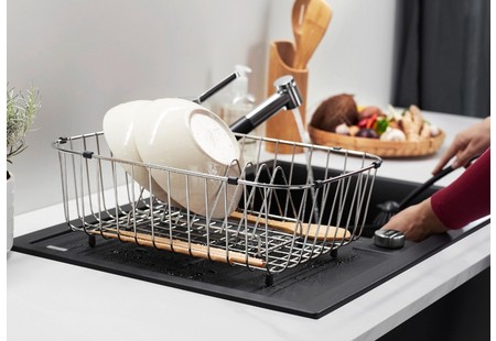 Чаша слева от смесителя создает дополнительное пространство справа для удобства.