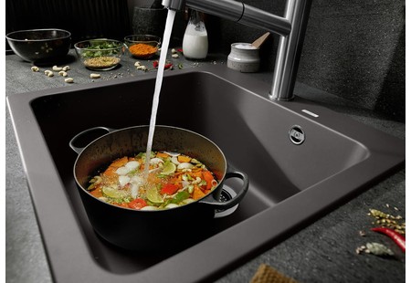 Мне понравилась мойка — черная, одна чаша; удобный клапан-автомат InFino, выглядит аккуратно и уютно.