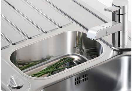 Основная чаша мойки у такой модели дополняется еще одной, меньшей по размеру. Она позволяет расширить функционал и одновременно делать сразу несколько дел. Поскольку габариты второй чаши существенно меньше, она играет вспомогательную роль и подходит не для всех задач. Для того, чтобы в полной мере использовать функционал мойки рекомендуется применение смесителя с поворотным изливом.