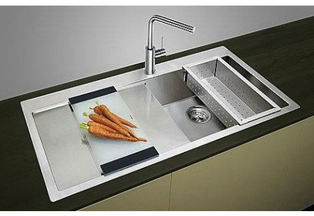 Чаша справа от крана имеет дополнительную рабочую область слева для комфорта использования.