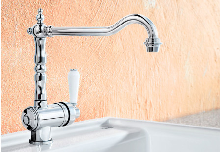 Поворотный излив позволяет поворачивать кран в удобную для пользователя сторону. Обычно угол поворота варьируется от 230 до 360 градусов. Направляется он в нужную сторону механически, т.е. рукой. Такой кран можно установить на мойку с двумя чашами. Для многих потребителей данный вариант удобнее, но за счёт подвижного механизма ломается он быстрее.