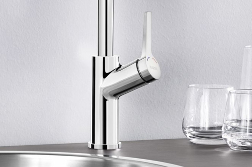 Управление смесителем происходит при помощи одного рычага, который позволяет выбирать как напор, так и температуру воды, двигаясь из стороны в сторону и вверх-вниз одновременно. Плюсом такого устройства является возможность «запоминания» ранее выбранной температуры.