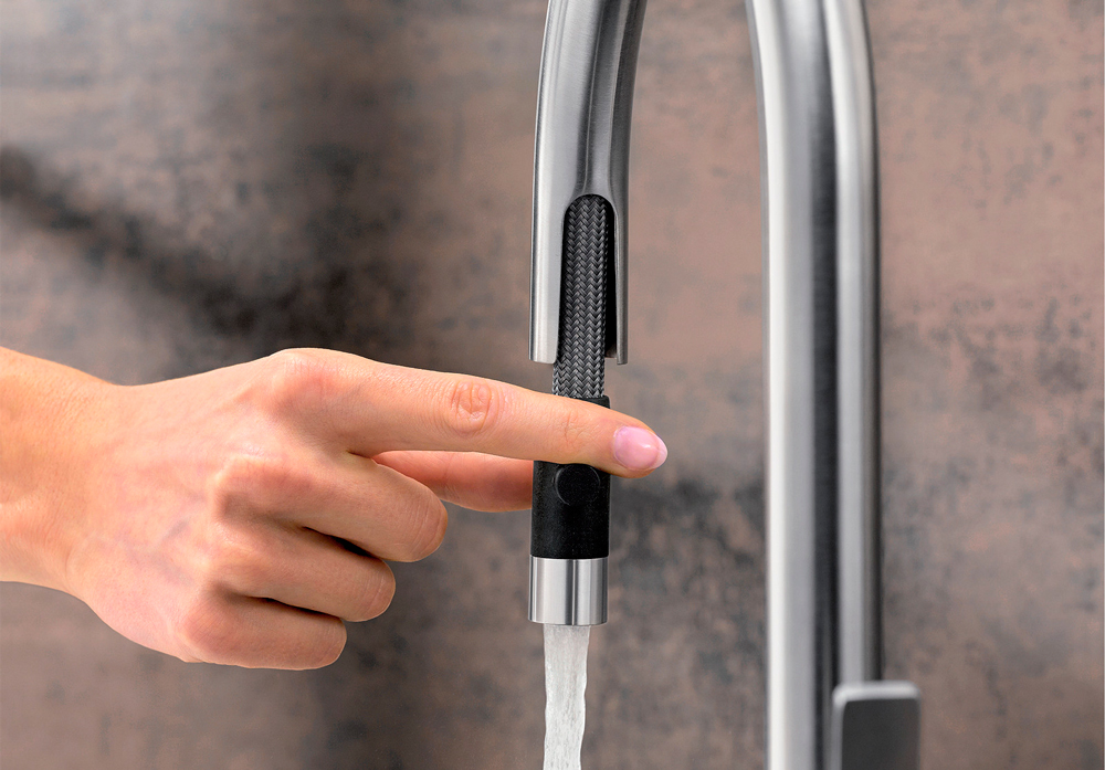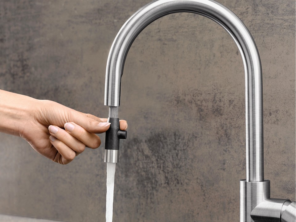 Смесители с выдвижным изливом оснащены специальным шлангом, который способен вытягиваться на значительное расстояние, позволяя использовать его как душ. Шланг может как скрываться в корпусе, так и находиться на виду. В последнем случае его чаще всего поддерживает специальная пружина, придающая ему форму и обеспечивающая устойчивость.