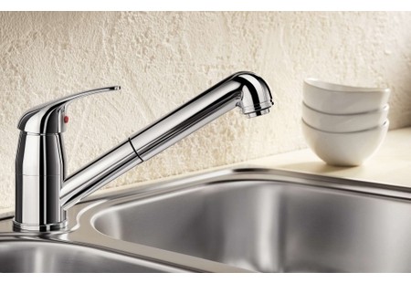 Смесители с выдвижным изливом оснащены специальным шлангом, который способен вытягиваться на значительное расстояние, позволяя использовать его как душ. Шланг может как скрываться в корпусе, так и находиться на виду. В последнем случае его чаще всего поддерживает специальная пружина, придающая ему форму и обеспечивающая устойчивость.