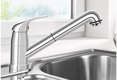 Практичность устройства выражается в сочетании выдвижного и поворотного механизма: выдвижной излив позволяет увеличить рабочую зону, удобен для очистки раковины и удобного наполнения ёмкостей, а поворотный модуль с углом поворота 80° обеспечивает широкий сектор обслуживания мойки, не мешая соседним поверхностям. Наличие аэратора даёт ровную мягкую струю, снижая разбрызгивание и экономя расход воды; при этом универсальная гибкая подводка упрощает монтаж и подгонку под инженерные коммуникации.