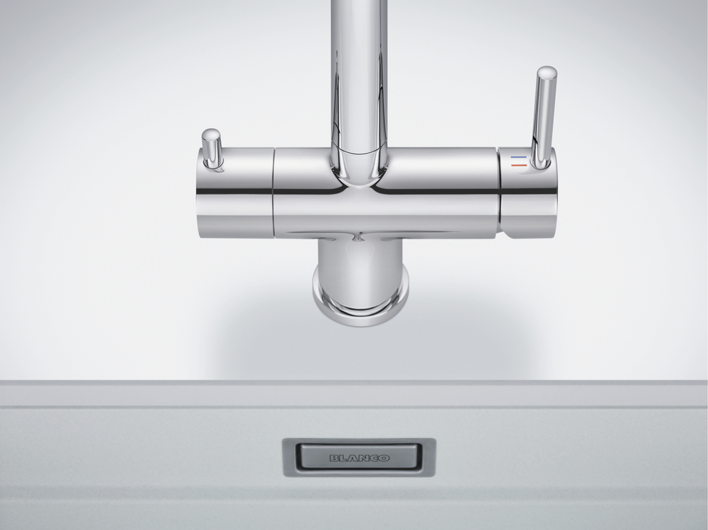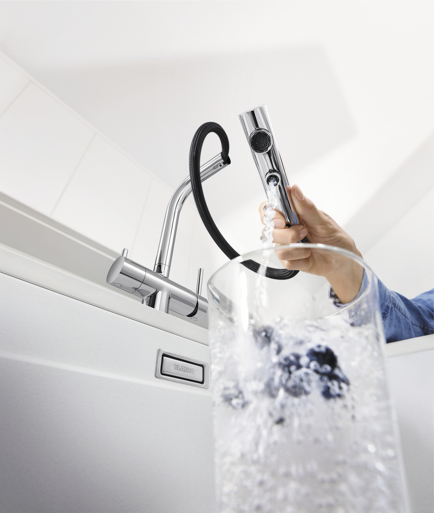 Смесители Blanco имеют раздельные каналы для водопроводной и фильтрованной воды, обеспечивая четкое разделение потока. Это позволяет выбирать и использовать воду в зависимости от потребностей, предотвращая смешивание неподходящей. Эта особенность гарантирует чистоту и сохранение качества фильтрованной воды.