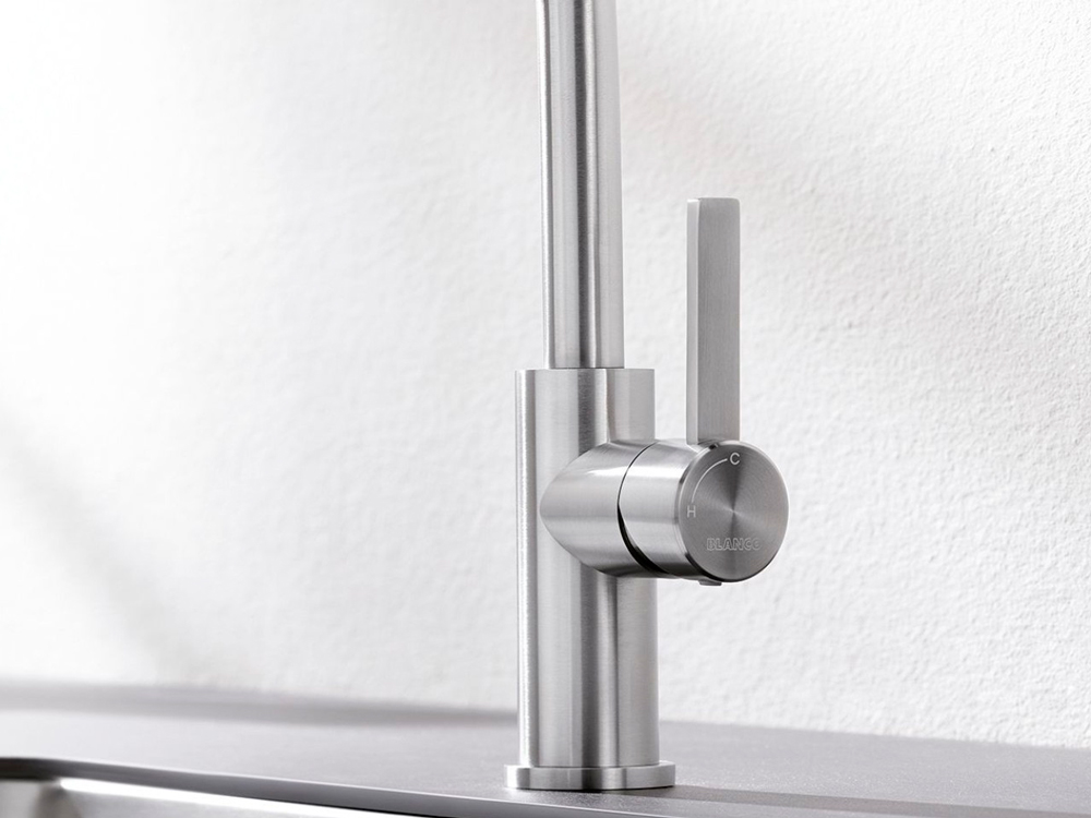 Смеситель Blanco Lanora S изготовлен из нержавеющей стали и завершён полированной поверхностью, которая подчёркивает современный характер кухни и легко сочетается с любыми рабочими поверхностями. Высота всего изделия составляет 296 мм, что обеспечивает удобный доступ к глубокой мойке и свободное размещение посуды под струёй. Высота излива 265 мм и длина 220 мм дают оптимальный вынос, позволяя направить поток точно в центр ёмкости, при этом конструкция остаётся компактной и аккуратной. Однорычажная схема управления делает регулировку расхода и температуры простой и интуитивной; рукоять занимает минимальное пространство и обеспечивает плавное управление при ежедневном использовании.