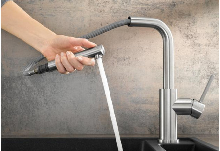 Купил смеситель, чтобы заменить давно служивший агрегат, и сразу отметил разницу. Выдвижной излив оказался действительно удобным: часто с его помощью мне проще наполнить большую кастрюлю или ополоснуть глубокую сковороду, не поднимая их на стол. Поворотный механизм ходит плавно, это облегчает мытьё в углах большой мойки. Полированная сталь выглядит аккуратно и легко чистится, на ней почти не видно следов от воды после быстрого протирания.