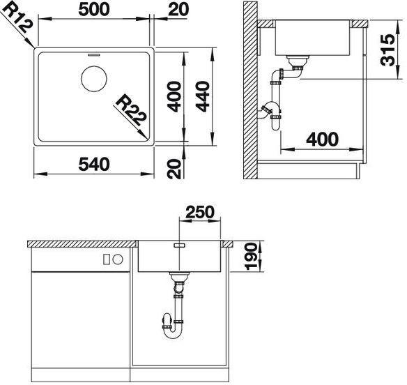Схема встраивания для мойки Blanco Andano 500-IF нержавеющая сталь полированная 518316