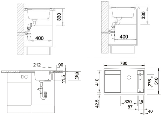 Схема встраивания для мойки Blanco AXIA II 45S антрацит чаша справа 516775