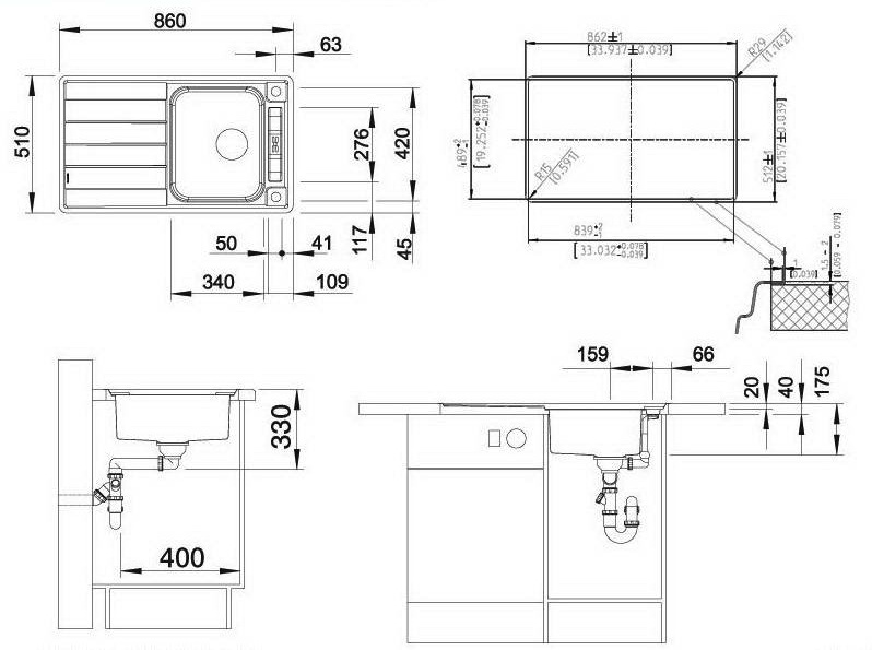 Схема встраивания для мойки Blanco Axis II 45 S-IF нержавеющая сталь чаша справа 516527