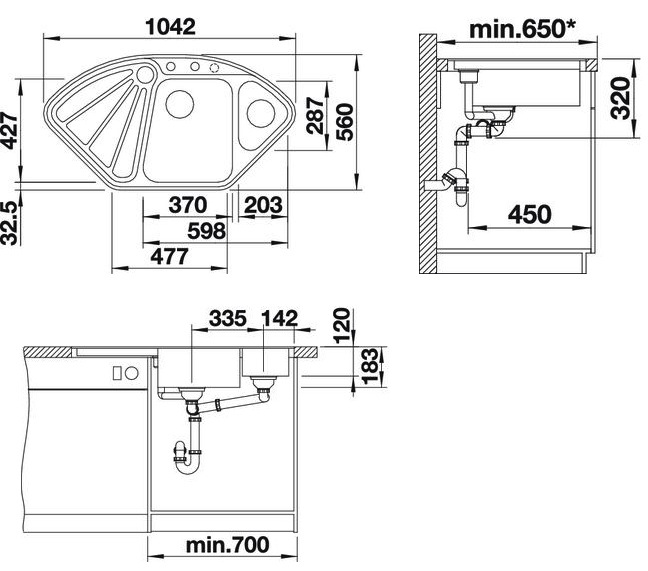 Схема встраивания для мойки Blanco Delta-F темная скала чаша справа 521262