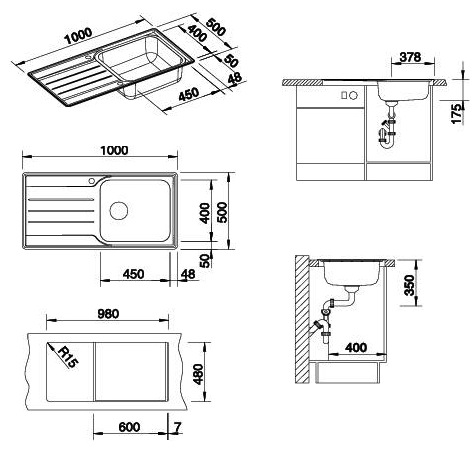 Схема встраивания для мойки Blanco Median XL 6 S крыло нержавеющая сталь полированная чаша справа