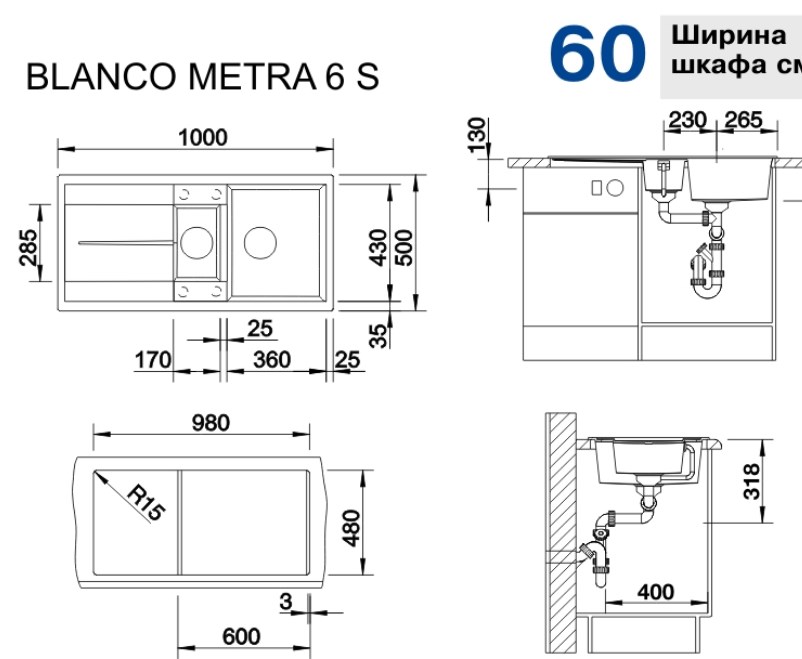 Схема встраивания 5 для мойки Blanco Metra 6S антрацит 513053