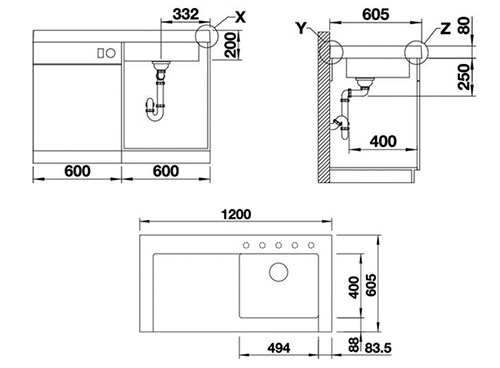 Схема встраивания для мойки Blanco Modex-M60 жасмин чаша справа клапан-автомат InFino 518332