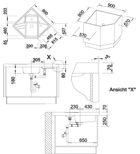 Схема встраивания для мойки Blanco Modus M 90 темная скала чаша справа клапан-автомат InFino 518892