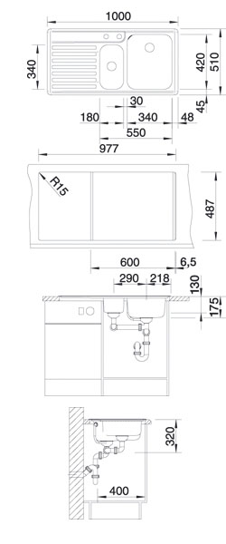 Схема встраивания для мойки Blanco Vektris 6 S нержавеющая сталь полированная чаша слева 513017