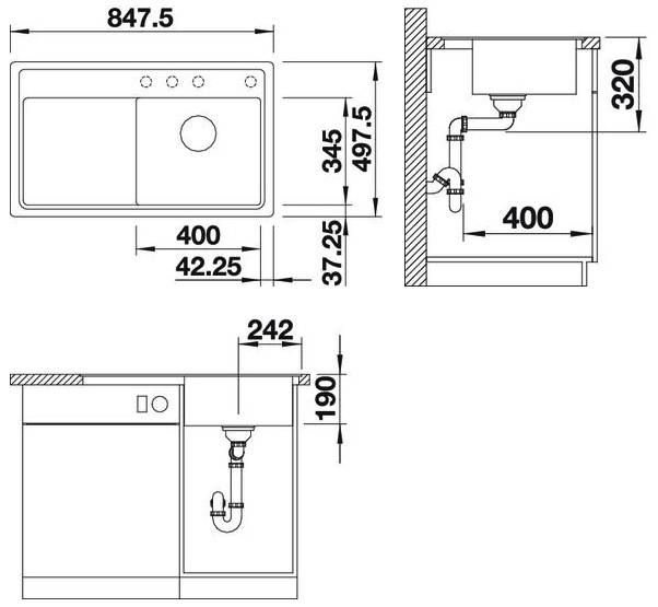 Схема встраивания для мойки Blanco Zenar 45 S-F антрацит чаша слева 519190
