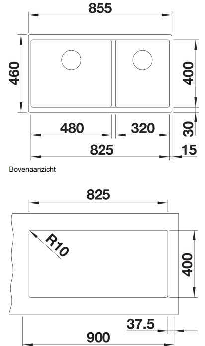 Схема встраивания для мойки Blanco SUBLINE 480/320-U мягкий белый клапан-автомат InFino 527168